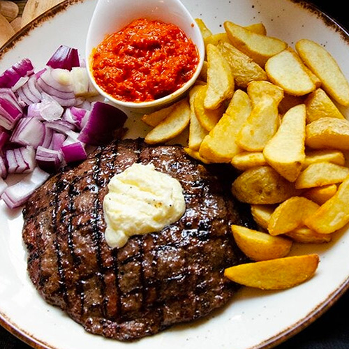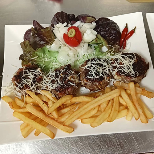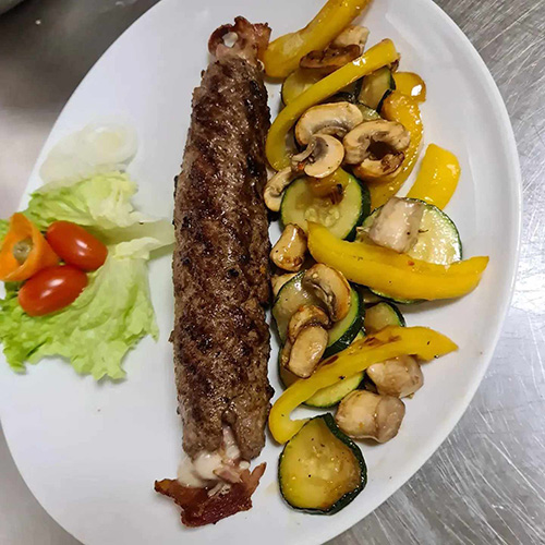 Poznati Leskovački specijalitet spremljen od mlevenog mesa sa dodatkom kuglom kajmaka na sredini porcije.