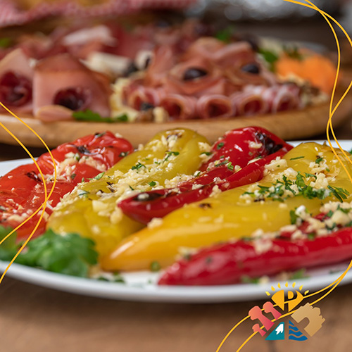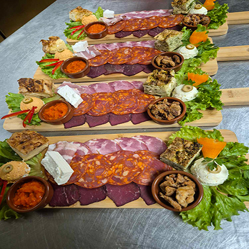 Svinjska pršuta, goveđa pršuta, kulen, dimljena slanina, kajmak, urnebes, feta, gibanica, zeljanica, ajvar, čvarci.